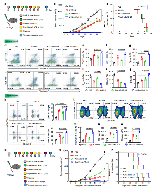 图5.AVAX 联合L&αPD-L1显著抑制肿瘤复发并诱导免疫记忆