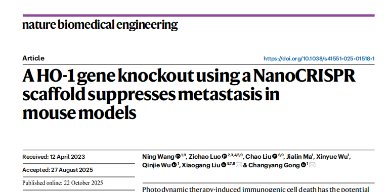 近日,四川大学联合新加坡国立大学在《Nature Biomedical Engineering》发表了题为"A HO-1 gene knockout using a NanoCRISPR scaffold suppresses metastasis in mouse models"的研究论文,其设计的Nano CRISPR支架(纳米载体化CRISPR基因编辑系统)显示出20.15%的基因编辑效率,同时不影响关键免疫细胞的基因编辑和杀伤功能。Nano CRISPR通过敲除HO-1基因,将肿瘤细胞的异质表型转化为ROS敏感状态,提升了ICD的疗效和原位疫苗接种效果。