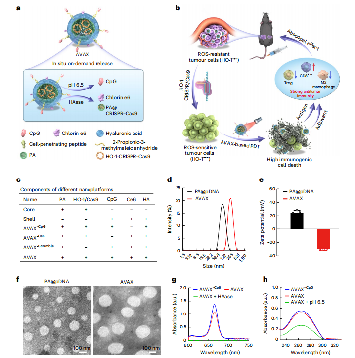 其设计的AVAX在透明质酸酶和弱酸性环境中能够完全释放CpG和Ce6,证实AVAX能够对肿瘤内外微环境产生分层响应。